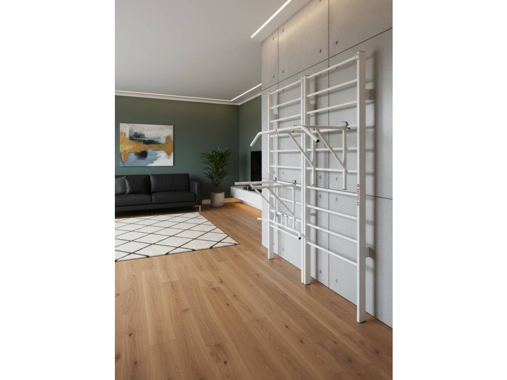Příčky žebřin jsou navrženy tak, aby byly předsazeny o 8 cm od zdi, což zajišťuje, že se při cvičení nebudete dotýkat zdi a tím ji chráníte před znečištěním. Konstrukce samotná je umístěna 4 cm od zdi, takže se nemusíte obávat poškození podlahových lišt. Žebřiny jsou zakončeny plastovými zátkami, které zabrání poškrábání podlahy a zajišťují bezpečné a šetrné používání.